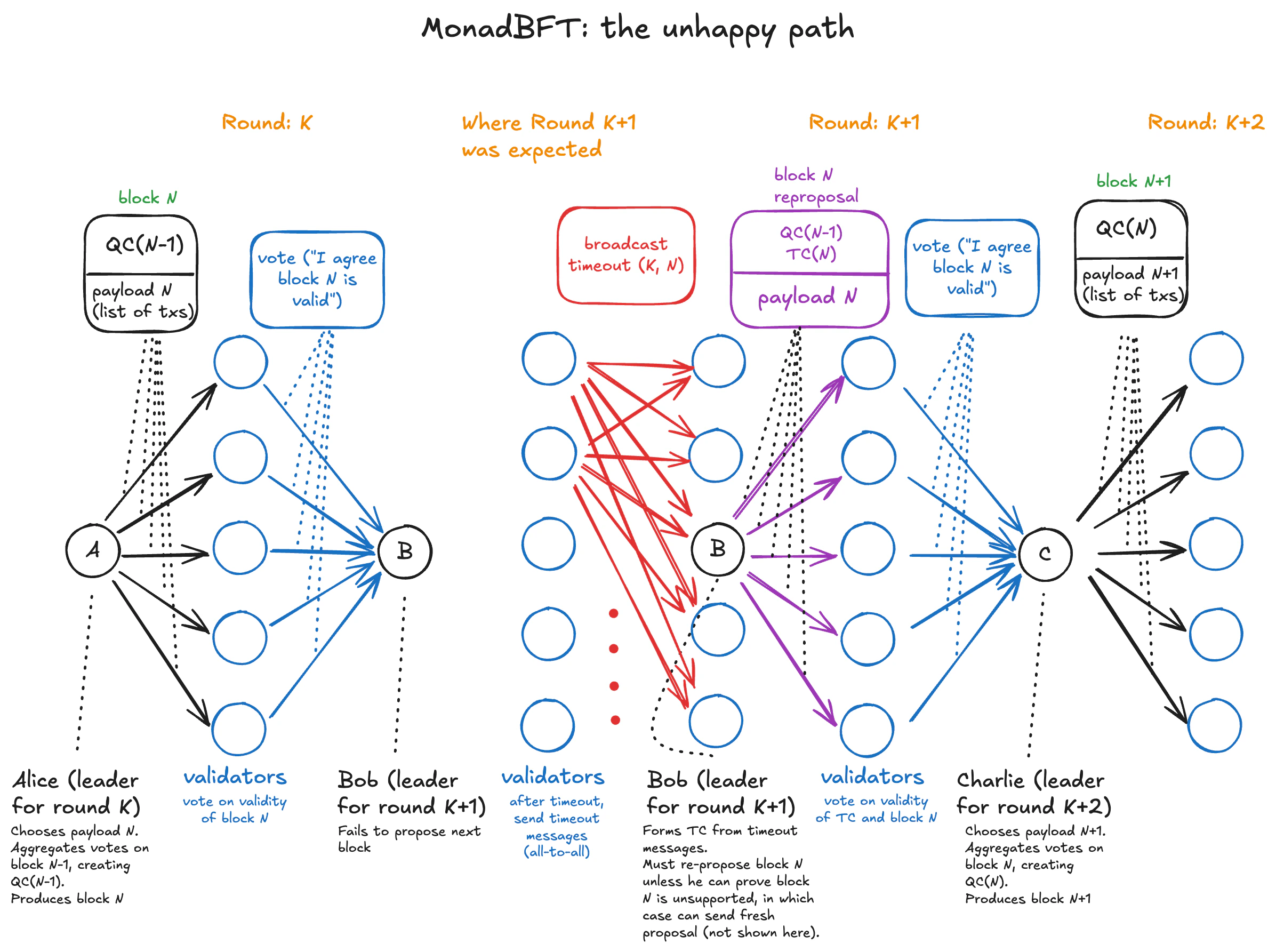 In prior implementations of pipelined HotStuff-family consensus protocols, the case where Bob misses his slot results in Alice’s proposal also being rolled back (tail forked). The intuition behind this is: Bob is the only person responsible for receiving everyone’s votes on Alice’s proposal, so when he goes offline, all of those votes are blackholed, making it hard to distinguish between the case where most validators voted YES for Alice’s proposal and the case where most validators rejected her proposal. For instance, in Fast-HotStuff, TCs carry enough information to prove that Bob missed his slot, allowing Bob to justifiably propose a block that skips Alice’s block, making Alice’s block a casualty. Bob simply re-proposes the same block height as Alice did, replacing Alice’s block in the final blockchain. This is the reason why pipelined HotStuff consensus mechanisms prior to MonadBFT frequently see pairs of missed slots. Tail forking is a serious weakness. When Alice’s block is proposed, if Bob sees valuable MEV opportunities in it, Bob—as QC builder (next leader)—may refuse to build the QC for Alice’s block and to propose his own block carrying Alice’s QC. In this case, validators cannot detect whether Alice failed to propagate her proposal or Bob refused to build a QC; therefore Bob is given an opportunity in round K+1 to propose a block. Bob can then extract high-value MEV by selecting only preferred transactions, and by reordering or replacing them at will. In other blockchains, unintentionally allowing blocks to be re-mined has resulted in massive impact. The key to MonadBFT’s No-Tail-Forking property lies in the handling of the missed slot situation. Intuitively speaking, in MonadBFT, TCs carry enough information to propagate the knowledge of the existence of Alice’s block forward even when Bob blackholes all of the votes about it. When it becomes Bob’s turn to propose, he is obliged to re-propose Alice’s block (based on the TC, which includes high_tip, aka a valid block header for Alice’s block) unless he can get a supermajority (2f+1) to attest to not seeing Alice’s block. The fact that a supermajority