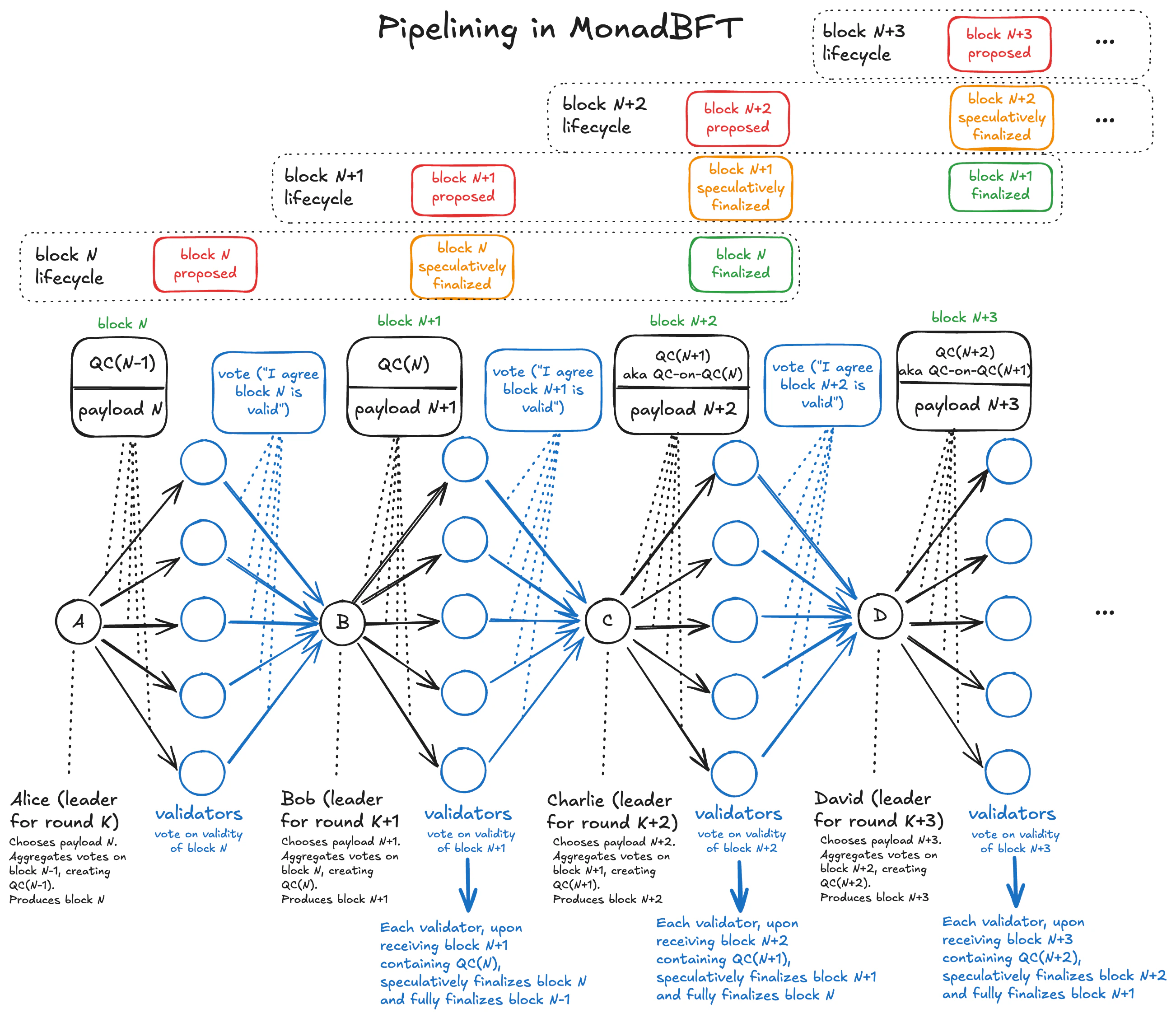 MonadBFT represents a major leap in Byzantine Fault Tolerant (BFT) consensus. It is responsible for ensuring that the Monad network aligns on valid proposed blocks efficiently and securely, while supporting 10,000+ tx/s and sub-second time-to-finality, while also supporting a large consensus node set. MonadBFT combines all of these properties while also being resilient to tail-forking, a critical weakness of pipelined leader-based BFT protocols where a leader can fork away its predecessor’s block. For a full description and deep technical dive into MonadBFT, please refer to the full research paper, the latest blog post from Category Labs and the original blog post introducing MonadBFT. MonadBFT achieves:- Speculative finality in a single consensus round, and full finality in two rounds.